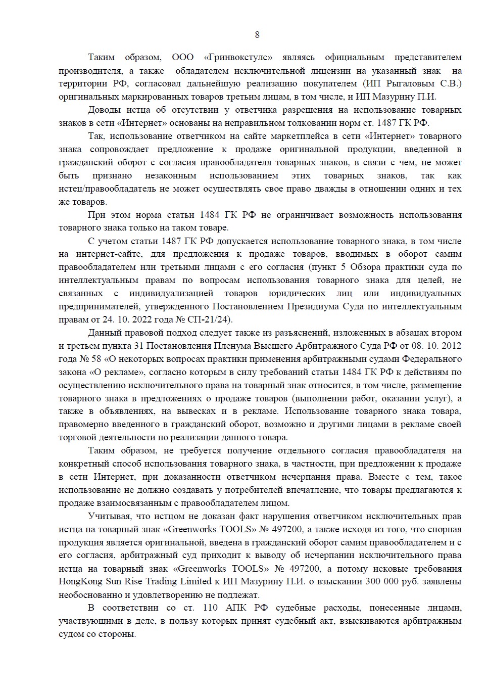 Арбитражный суд Пензенской области полностью отказал компании HongKong Sun Rise Trading Limited в удовлетворении исковых требований. Суд согласился с нашей позицией, признав, что представленные доказательства позволяют отследить всю цепочку поставки и подтверждают введение товара в оборот с согласия правообладателя. Судебные расходы отнесены на истца.