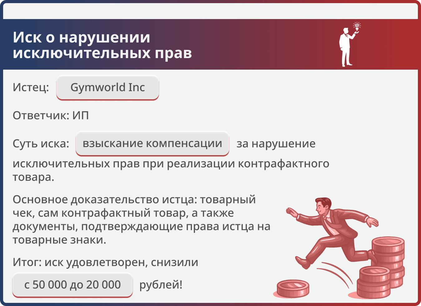 Защитить ИП от значительных финансовых претензий по иску о нарушении интеллектуальных прав, минимизировать размер компенсации и судебных расходов, избежать длительного и затратного судебного разбирательства.